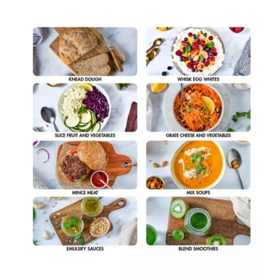 the machine will easily process capacities up to 1.5kg of pastry, 1.2kg dough, blend 1.8litre soups, chop 1.4kg Meat, whisking 8 egg whites.