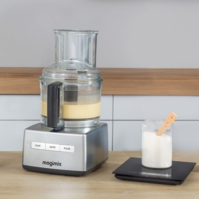 Ideal for weighing ingredients straight into bowl, i.e. Making Dough - put empty Magimix bowl with Dough blade on the scales, press TARE add first ingredients, 250g flour, press TARE, 5g salt, press TARE, 160ml water with 5g Yeast stirred in, place bowl on Magimix base, make sure dough blade is located correctly - press pulse to process, when ball of dough forms near handle stop.